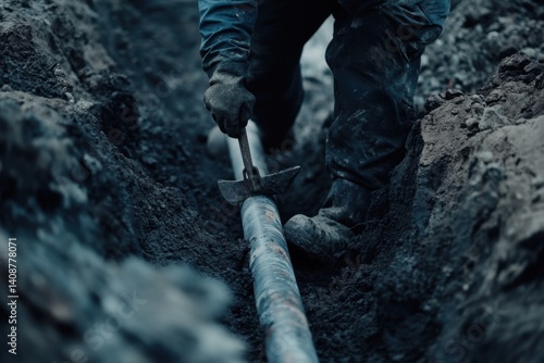 A construction worker laying pipes in a trench at a construction site. Featuring pipe laying and trench work