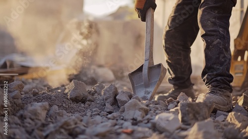 A construction worker removing debris from a building site. Featuring efficiency and cleanliness