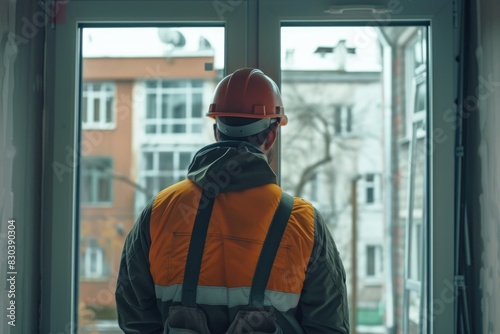 A construction worker standing in front of a window. Ideal for construction industry concepts