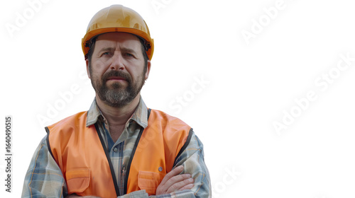 A construction worker wearing an orange vest and yellow hard hat, standing with arms crossed and a serious expression.