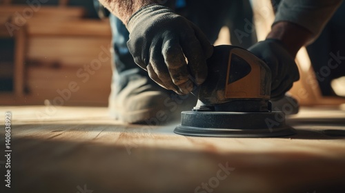 A construction worker working with a power sander on wood surfaces. Featuring craftsmanship and technique