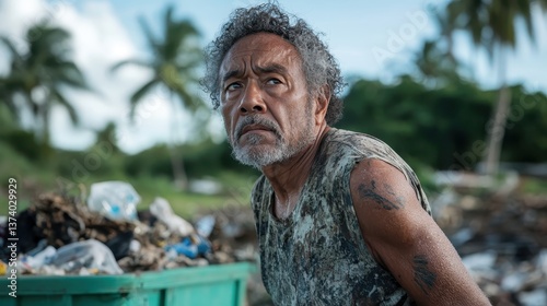 A contemplative man rests near a pile of trash, showcasing a connection to nature and human struggles, emphasizing the contrast between beauty and neglect in our environment.