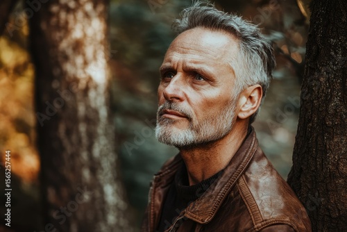 A contemplative mature man with gray hair, wearing a brown leather jacket, stands against a tree in a forest.