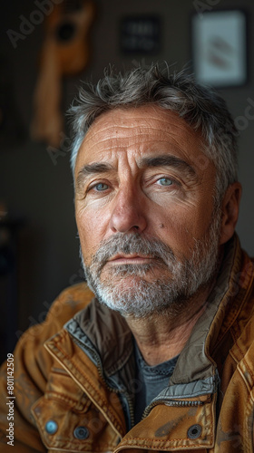 A contemplative middle-aged man with greying beard, blue eyes, wearing a brown leather jacket, indoors with a serious gaze.