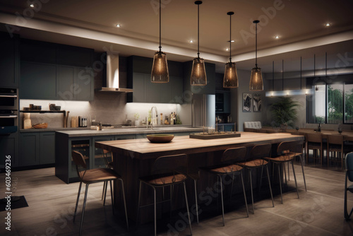 A contemporary and open-concept kitchen and dining area with a large center island, barstools, and pendant lights for a social and functional space. Generative AI