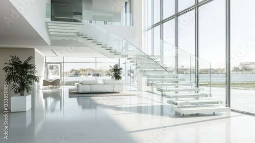 A contemporary glass staircase rises elegantly in a spacious, sunlit living area featuring large windows and minimalist decor overlooking the water