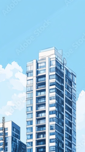 A contemporary high-rise building set against a bright blue sky with fluffy white clouds, showcasing urban architecture.