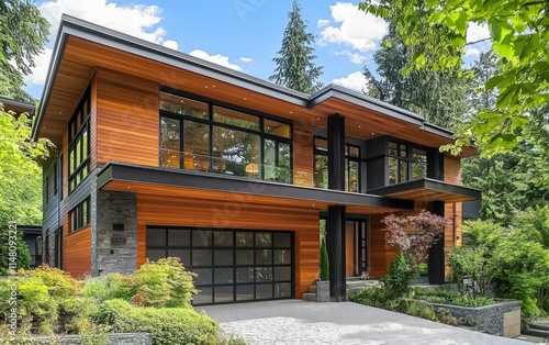 A contemporary house with minimalist architecture, sharp edges, and warm wooden paneling