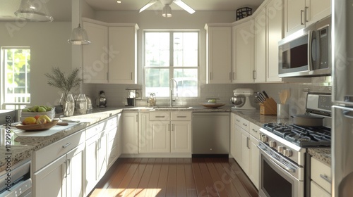 contemporary, kitchen, white, cabinetry, granite, countertop, stainless, steel, appliance, ceiling, photorealistic, high, resolution, smooth