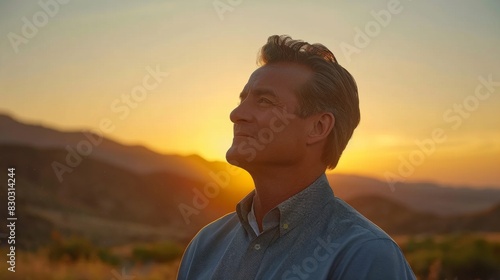 A content man stands before a sunset, the golden sky highlighting his serene expression in a cinematic capture.