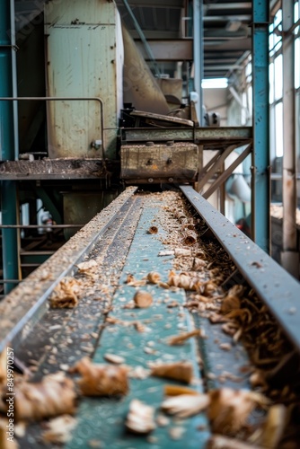 A conveyor belt is filled with wood chips