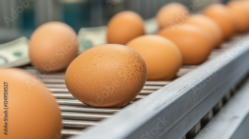 A conveyor belt transports brown eggs alongside dollar bills, highlighting the intersection of food production and economics.