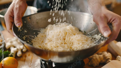 A cooking class scene focused on healthy cuisine, highlighting shirataki noodles preparation with soy sauce and ginger