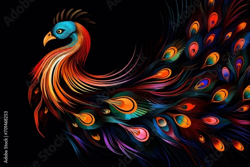 peacock, neon, glowing, colourful, black background, bird, beautiful, graphic, illustration, art, design