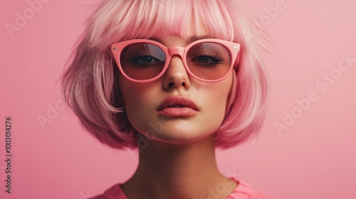 A cool portrait of a woman with a pink bob haircut wearing pink sunglasses, set against a soft pink background, symbolizing contemporary fashion and youthful exuberance.