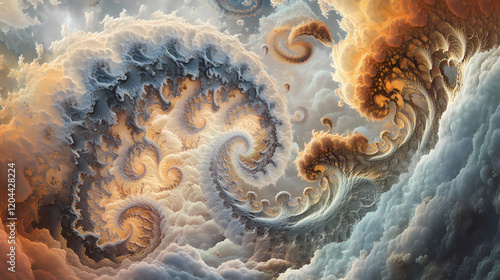 A cosmic, ethereal scene with fluffy clouds swirling in intricate fractal designs. Cosmic Storm. Illustration