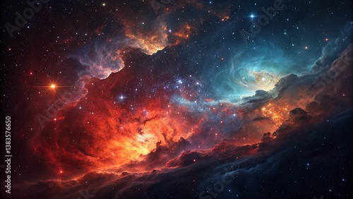 "A cosmic nebula with swirling clouds of red, orange, and blue gases, casting glowing light into the dark expanse of space. Brilliant stars dot the sky, and the colors blend together in an abstract, m