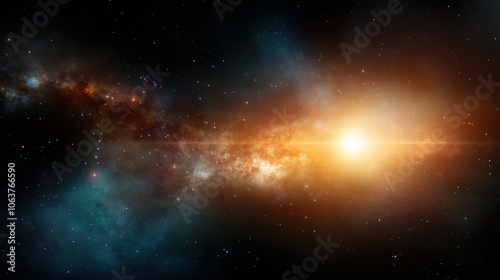 A cosmic scene unfolds with a radiant star at its center, surrounded by a breathtaking galaxy of swirling stars and colorful nebulae, showcasing the universe’s beauty.