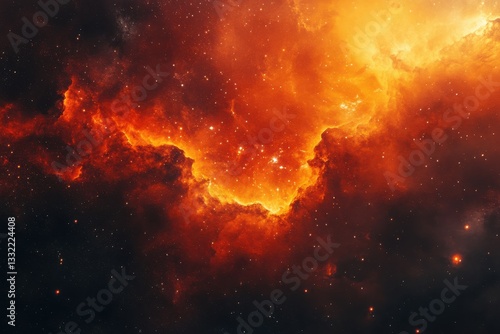 A cosmic scene with vibrant orange and red hues against a dark background resembling a celestial body or nebula