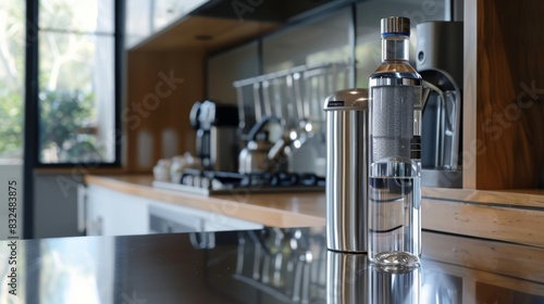 A countertop water filter next to a glass water bottle for drinking clean tap water instead of bottled water.