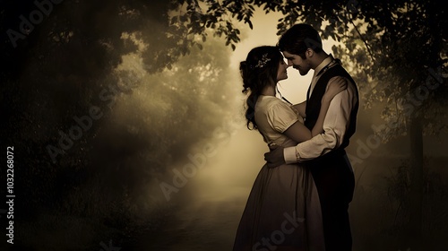 couple, love, romance, forest, mist, haze, tree, hugs, hug, kiss, man, woman, portrait, vintage, retro, fashion, clothing, dress, suit, shirt, vest, hair, long, brown, dark, light, soft, tender, passion, together, happy, romantic, affectionate, intimate, nature, timberland, fog, dreamy, enchanted, magical