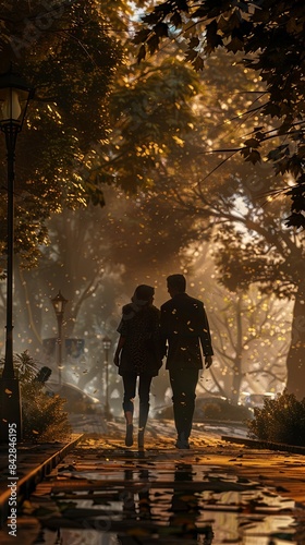 A couple having a romantic stroll in a park. Realistic.