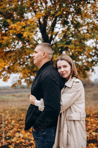 A couple hugging under a yellow-leaved autumn tree. Romantic walk in the fall park, warm atmosphere, love, and harmony surrounded by colorful foliage.
