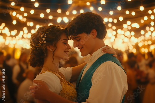 A couple in traditional Bavarian attire dancing together at an Oktoberfest celebration, surrounded by a crowd