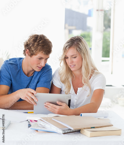 A couple look at a tablet together