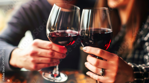A couple sharing a moment with glasses of red wine, focusing on the hands holding the glasses and the intimate setting.