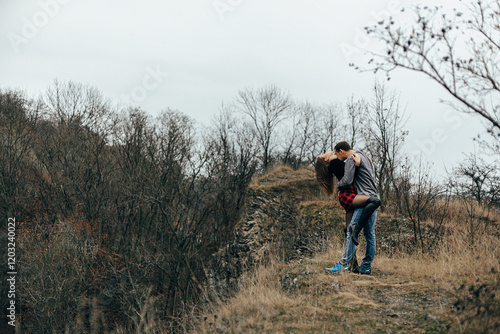 a couple standing in an open area, perhaps on a hill, with dry grass and golden trees around them, which could be seen in autumn or winter. The sky is cloudy.