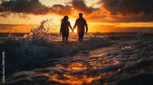 A couple walks hand-in-hand along the beach at sunset, waves crashing around them.