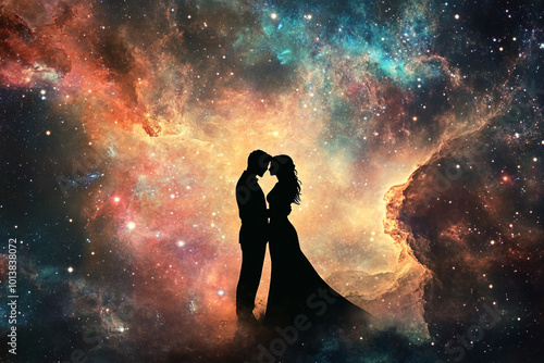 A couple's silhouette against the backdrop of an ethereal galaxy, symbolizing their love as vast and infinite in space.