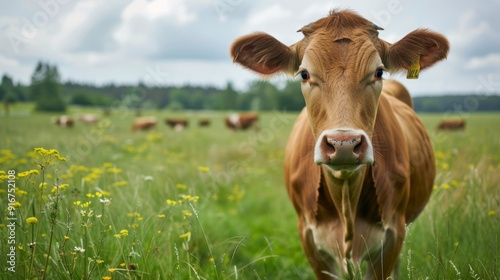 cow, pasture, animal, grass, meadow, farming, agricultural, cattle, nature, field, green, grazing, farmland, rural, mammal, summer, brown, farm animal, dairy, countryside, landscape, beef, white, milk, country, sky, bovine, blue, herd, standing, nose, ranch, bull, looking, sunny, domestic, farm animal, environment, head, young, day, portrait, calf, pastoral, background, curious, eating, face
