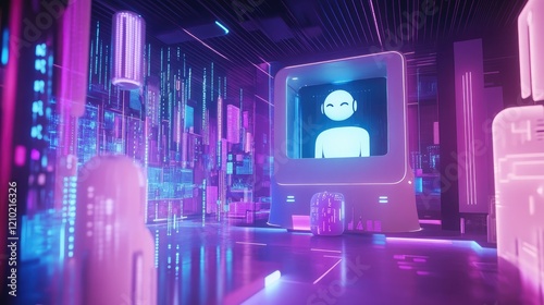 A coworking space where a 3D AI assistant pops out of a shared screen, surrounded by futuristic data visuals.