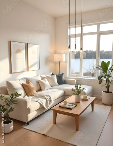 A cozy and inviting living room with a large beige sectional sofa, a wooden coffee table, and a potted plant.