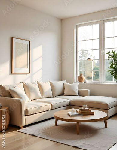A cozy and inviting living room with a large beige sectional sofa, a wooden coffee table, and a potted plant.