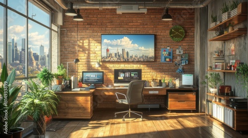 A cozy and modern workspace featuring wooden elements, greenery, and a panoramic city view, perfect for productivity and inspiration.