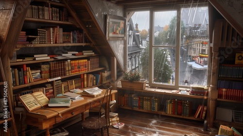 A cozy attic workspace with a wooden desk, bookshelves filled with old books, and a small window offering a view of a rainy city street.