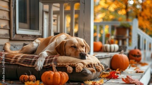 A cozy autumn afternoon with a dog napping on a porch, pumpkins and leaves around