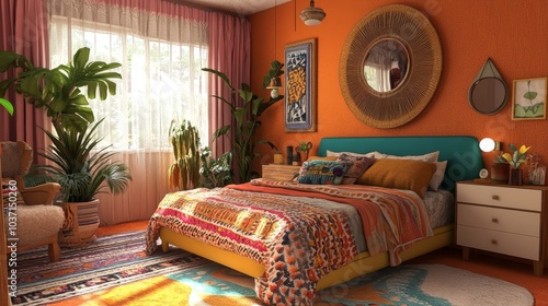 bohemian, bedchamber, vibrant, colourful, eclectic, decor, comfort, creativity, style, cosy, bed, plant, textile, relaxation, warmth, texture, pattern, expression, harmony, art, vintage, retro, nostalgia, rug, mirror, drape, pillow, lamp, artwork, inviting, mood, spirit, identity, individuality, personality, homemade, taste, cheerful, joyful, nature, serene, peaceful, resting