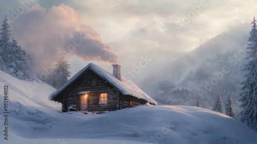 cabin, mountain, snow, winter, forest, tree, pine, fir, chimney, smoke, cosy, warm, light, window, door, frost, landscape, nature, cold, white, blue, grey, sky, cloud, dusk, evening, twilight, serene, tranquil, peaceful, rustic, wooden, log, isolated, remote, scenic, beautiful