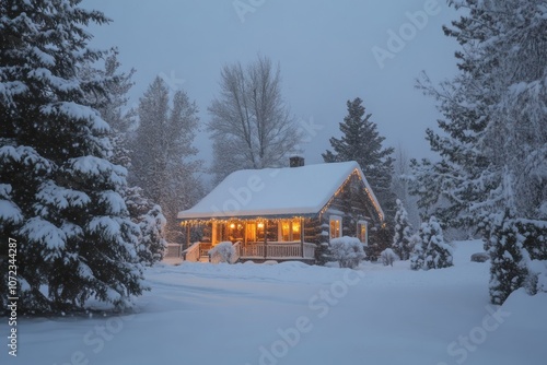 cabin, snow, winter, wonderland, cosy, light, string, illuminated, glowing, warm, snowy, tree, forest, landscape, night, evening, dusk, blue, white, dark, cold, frost, glacé, quiet, peaceful, serene, magical, enchanting, fairy tale, rustic, wooden, chimney, roof, window, porch, balcony, railing, house, home, nature, outdoors, scenery, season, christmas, holiday, festive, celebration