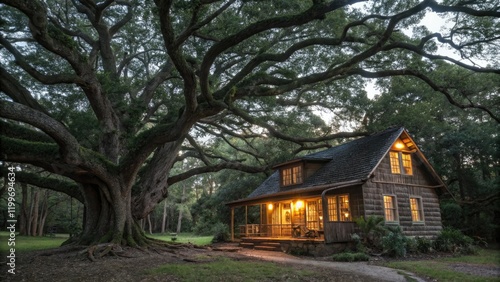 A cozy cabin nestled among the branches of a ancient tree, with a warm and inviting glow emanating from its windows, cabin in the woods, warmth, natural shelter