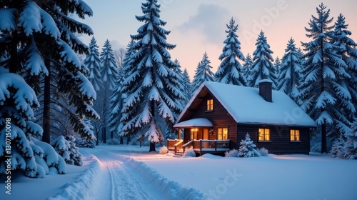 A Cozy Cabin Nestled Amongst Snow-Covered Evergreens on a Tranquil Winter Evening