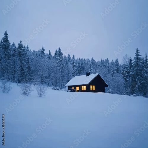 A cozy cabin nestled in a snowy landscape, illuminated warmly against the serene winter backdrop of trees and soft snow.