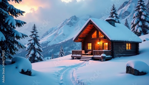 A cozy cabin nestled in a snowy landscape, perfect for a relaxing holiday getaway , relaxation, fire