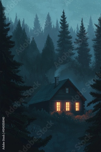 A cozy cabin nestled in the heart of an ancient forest, surrounded by towering pines and misty air at night, illuminated only by the warm light coming from its windows.