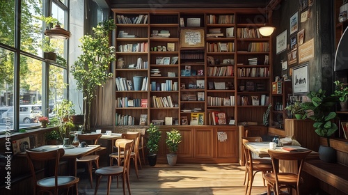 A cozy cafe with wooden shelves, books, and coffee cups, perfect for a relaxed afternoon