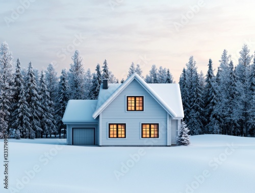 A cozy house surrounded by snowy trees during a serene winter evening.